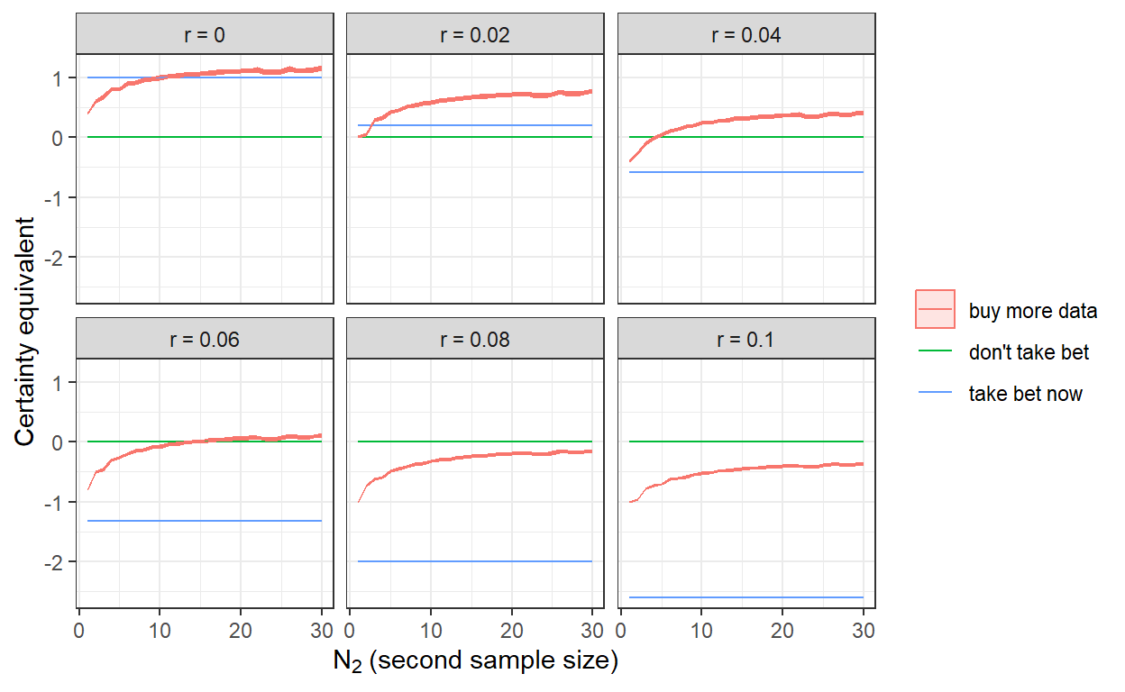 So with this setup, if you are risk-neutral (\(r=0\)) you would be willing to pay $1 to see about ten or more coin flips. For the intermediate levels of risk aversion (say, \(r=0.02\) and \(r=0.04\)) the extra information is even more valuable. But for the most risk-averse types (say, \(r\geq 0.08\)) the information is not valuable because it wouldn’t change their decision to not take the bet after observing the extra \(N_2\) coin flips.