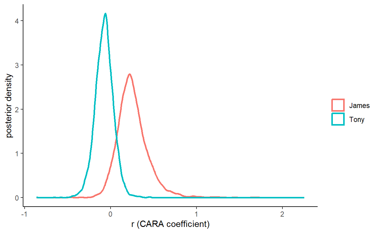 }First, let’s take a look at our estimated CARA coefficients, \(r\). The posterior distributions of these are shown in the figure below. It turns out that I am risk-averse (posterior mean \(r\approx 0.26\), standard deviation \(0.19\)), and Tony is ever so slightly risk-loving (posterior mean \(r\approx -0.08\), standard deviation \(0.11\)). However there is lots of posterior uncertinaty in these estimates, and you can see this in the plot below as these being substantial posterior density for both of us either side of zero.