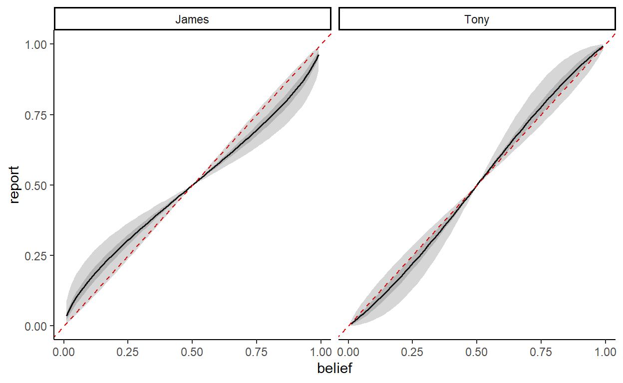 But what I’m really interested in is how much the model says we should shade our tips toward 50%. So in the figure below, I plot the reporting function. That is, for each belief (horizontal coordinate), what tip should I report (vertical coordinate)? The black line shows the posterior mean prediction, and the gray areas express the posterior uncertainty in 50% and 95% Bayesian credible regions. My reporting function looks like it is substantially different to truthful reporting (red dashed line). Since I am risk-averse, I should report probabilities closer to 50% than they actually are. Tony, being slightly risk-loving, should shade in the other direction, pulling probabilities to their extremeties. However there is not really that much difference between Tony’s reporting function and the truthful reporting line, so I wouldn’t get too excited about him being anything different to risk neutral.